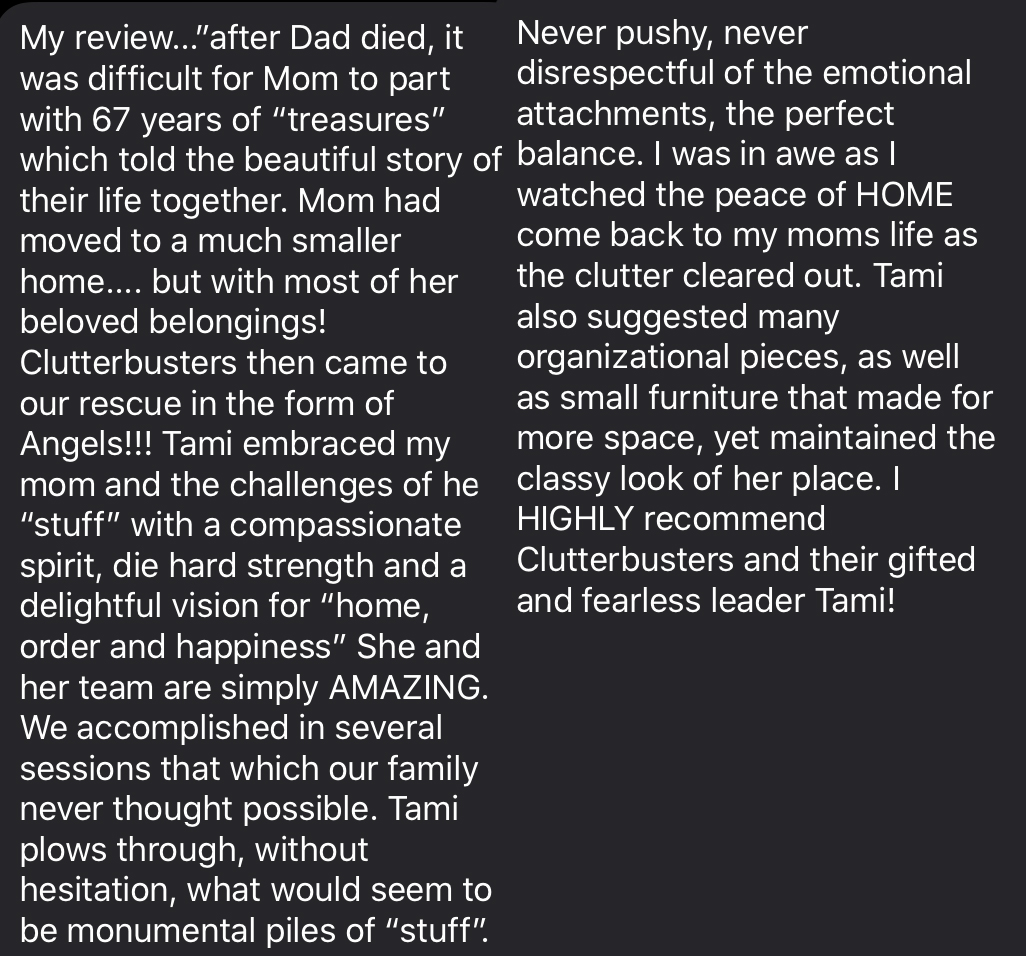 Decluttering projects may include: sorting, purging, purchasing of storage solutions, labeling, filing, categorizing, closet/clothing organizing, pantry organization (creating healthy pantries), photos/memorabilia, garages/attics*, downsizing, donation removal, prepping for an estate or yard sale, pre-move, post-move, organizing & space planning, prep furniture choices for space, project management consulting, organization-related business consulting, and time management & productivity strategizing.